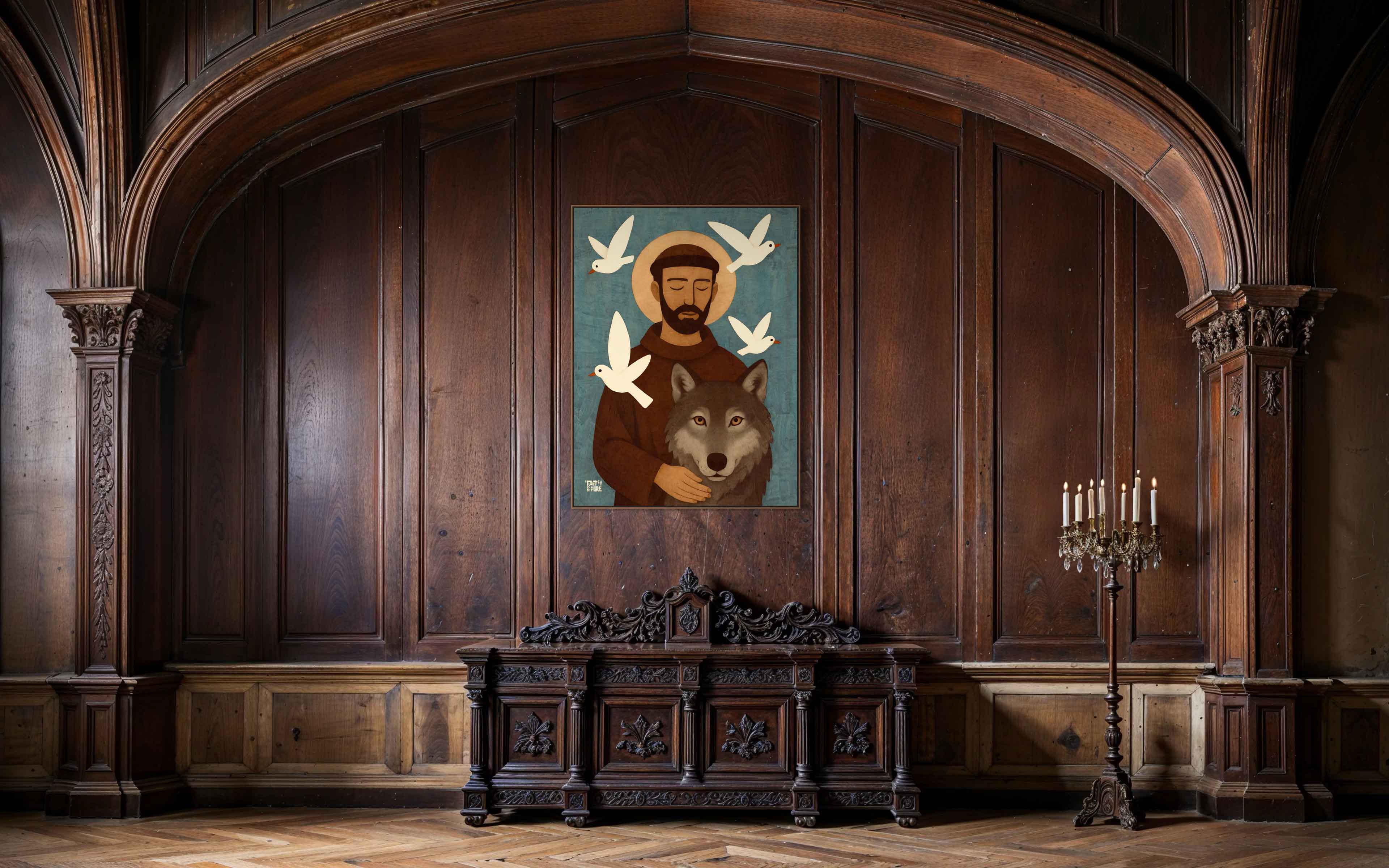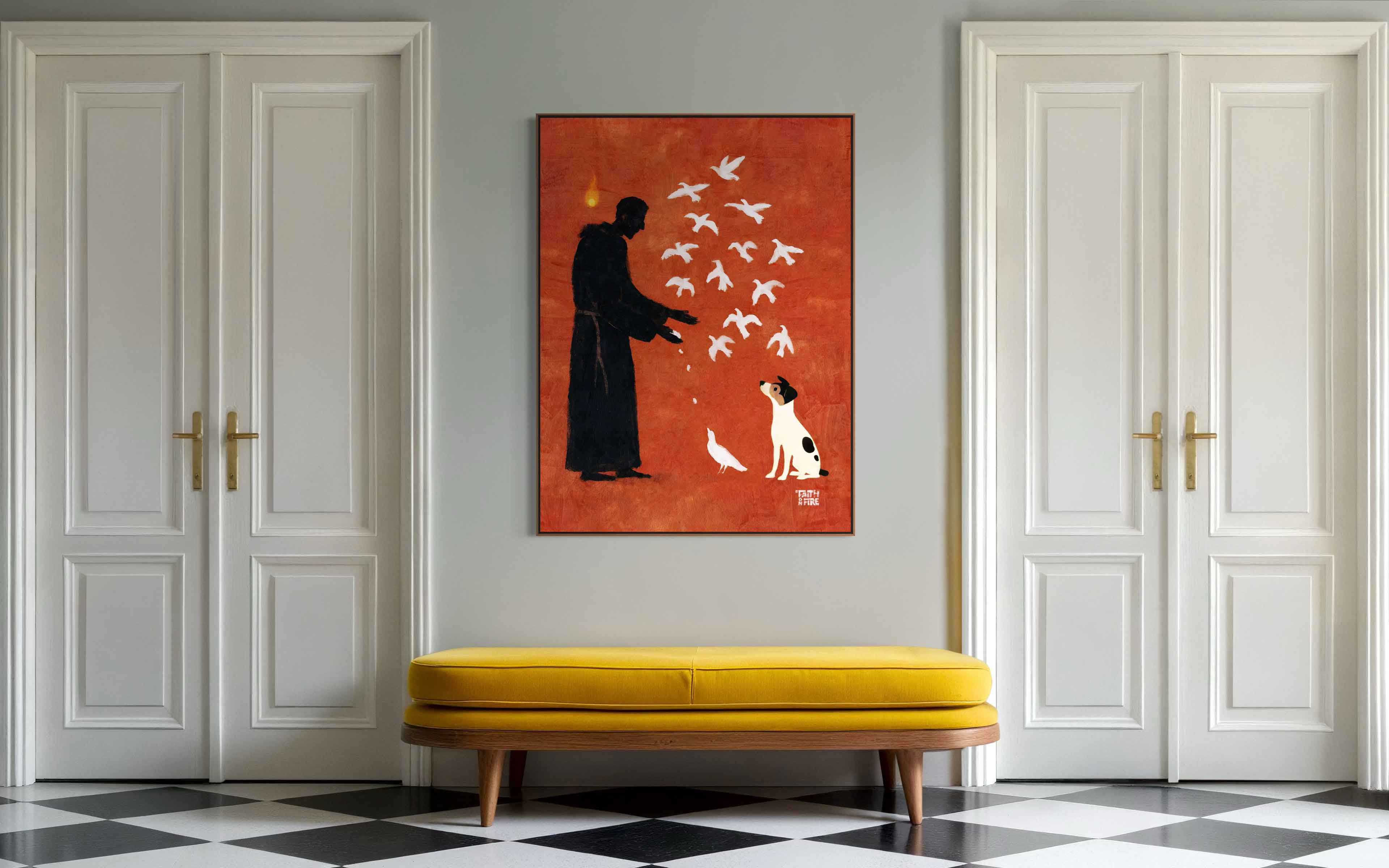 The warm tones, gentle textures, and iconic halo give the artwork a sacred feel while still being modern and minimalist. Perfect for homes, nurseries, prayer spaces, pet memorial corners, or as a gift for anyone grieving the loss of a beloved dog.