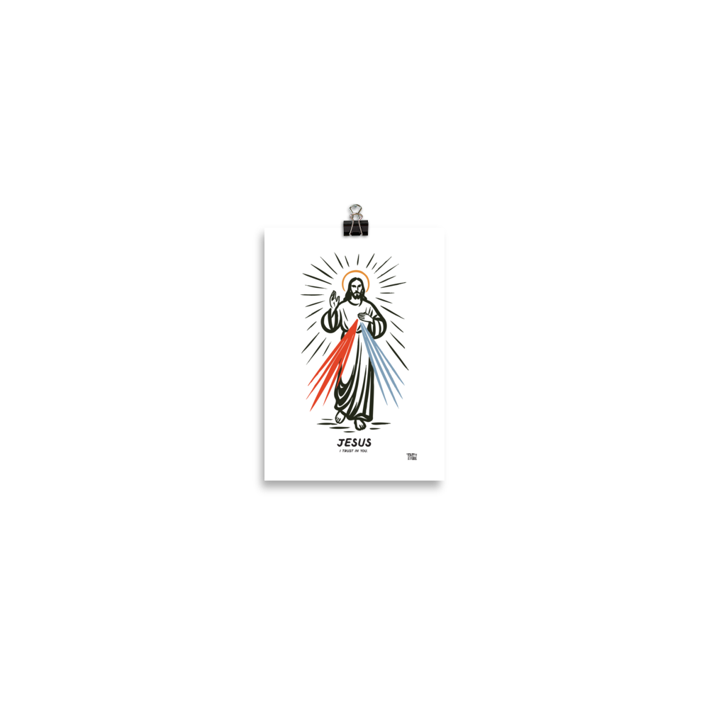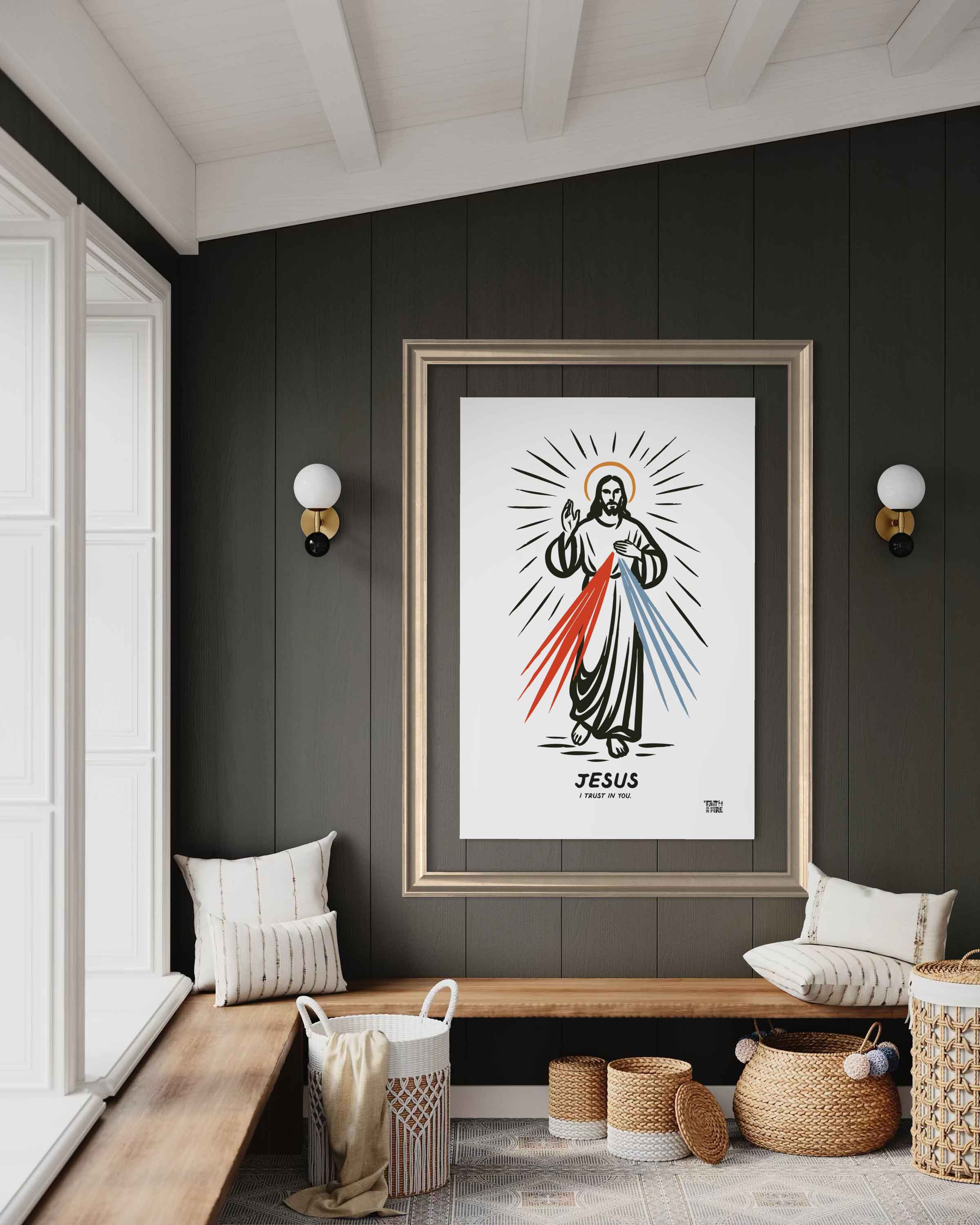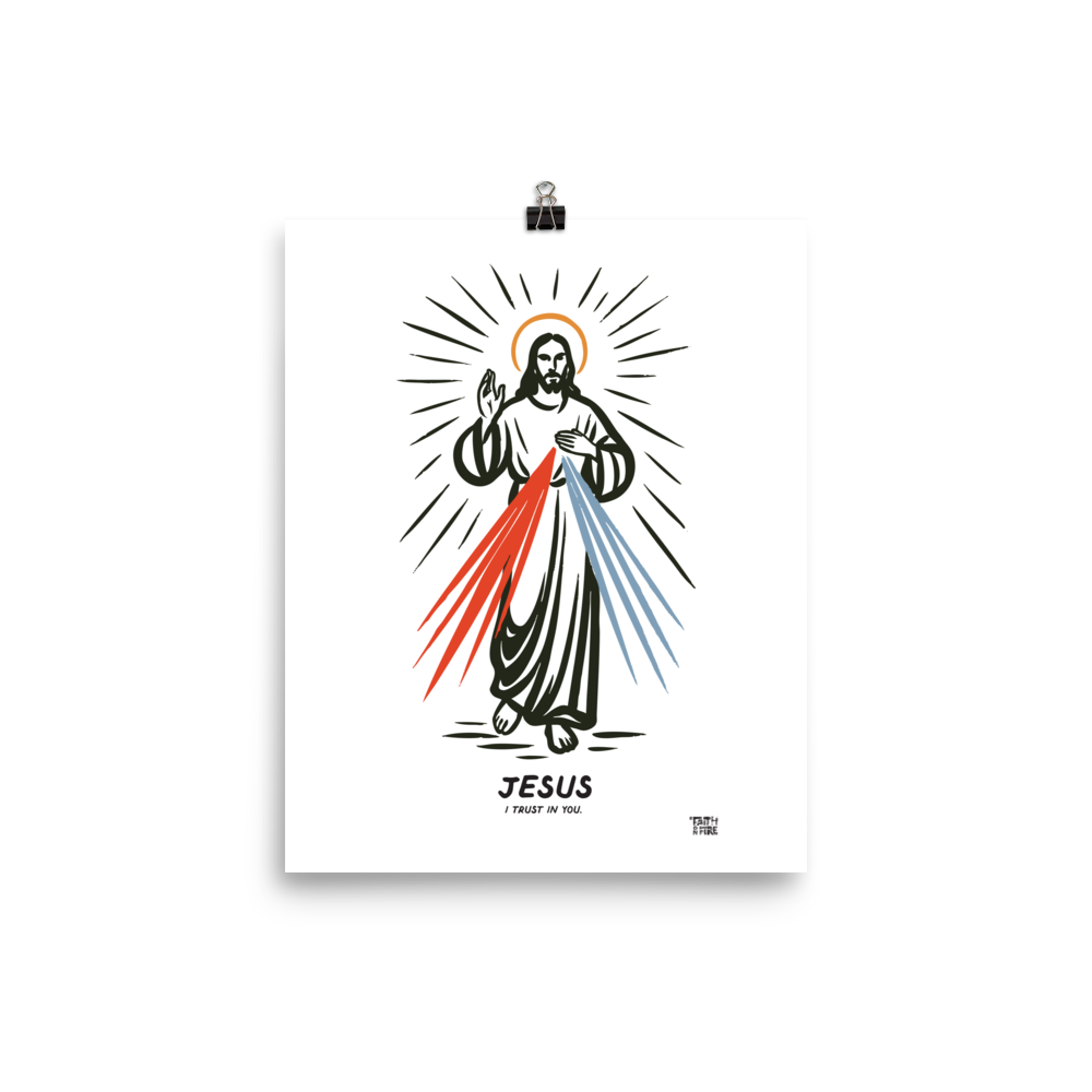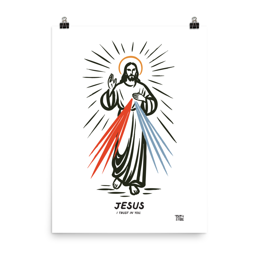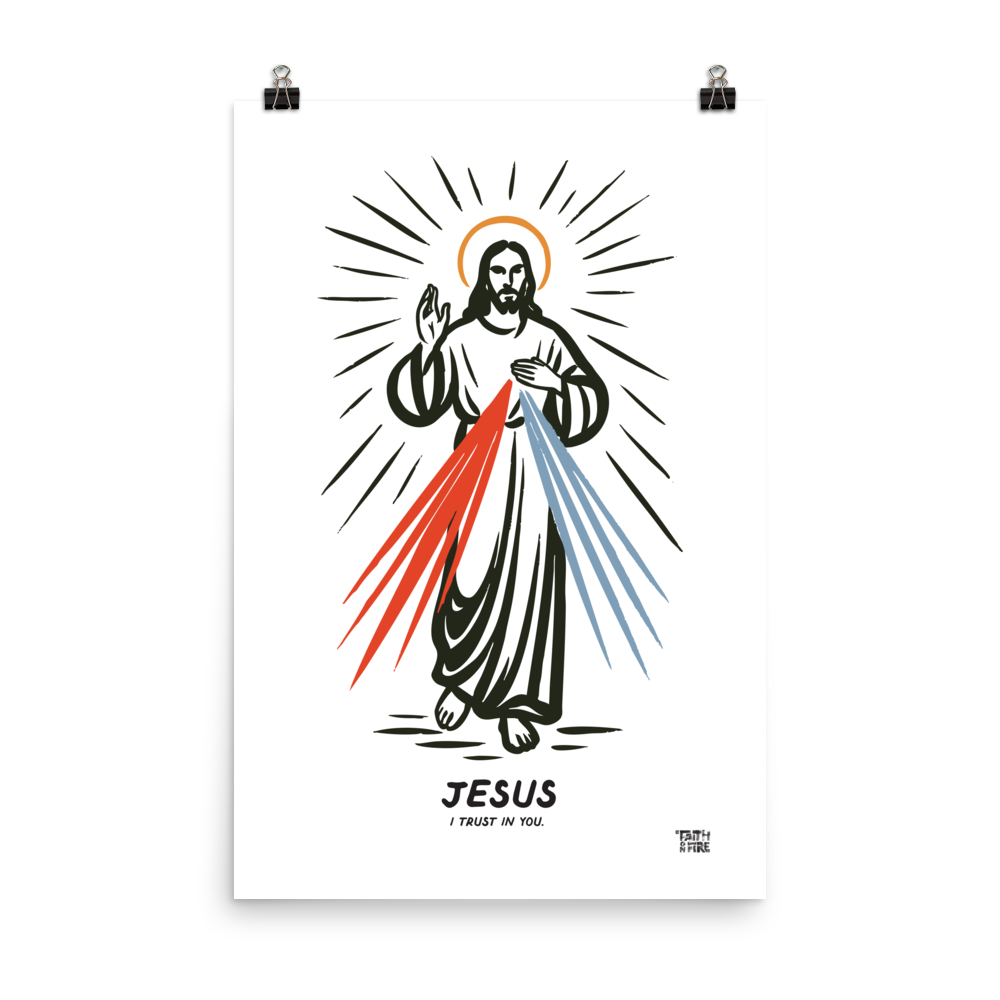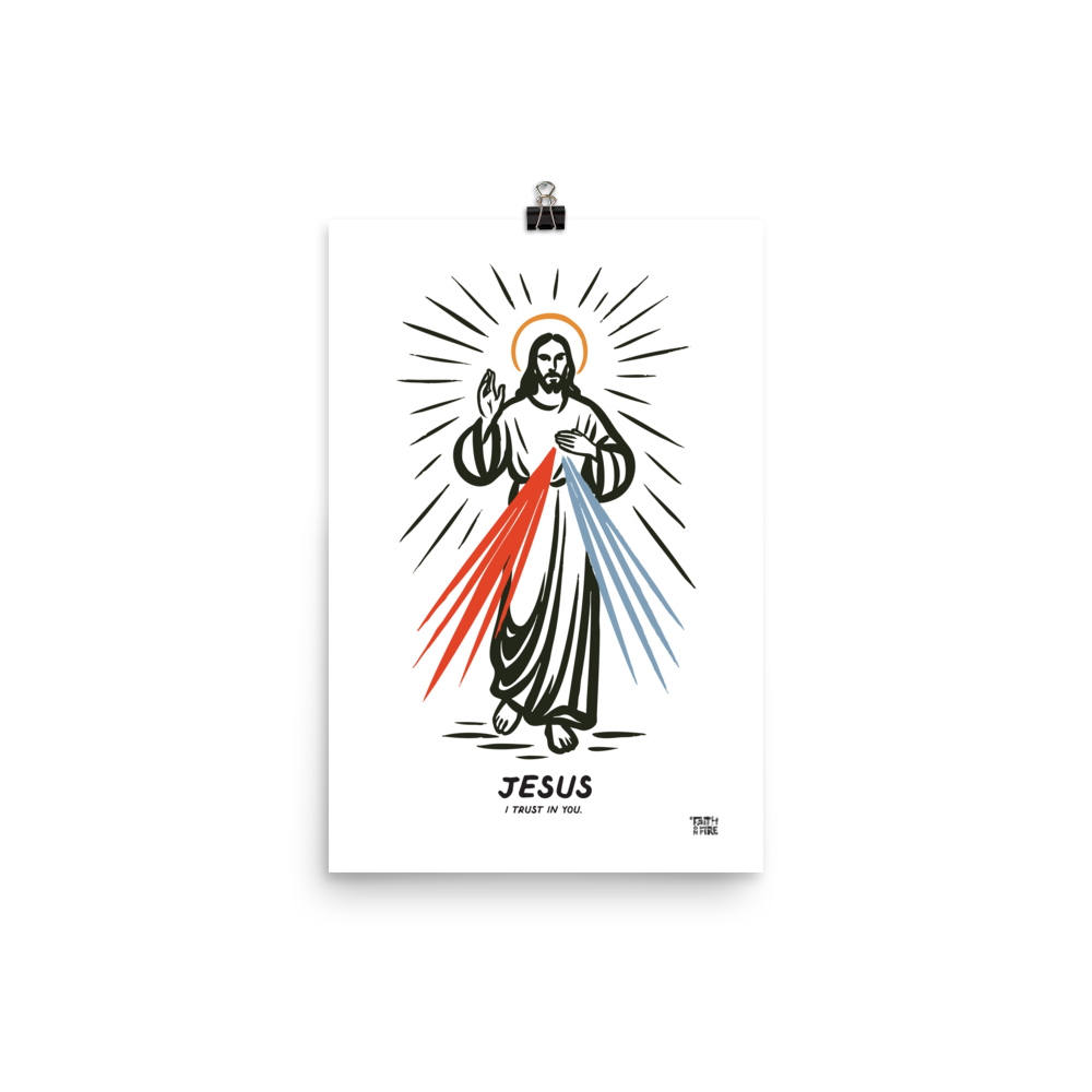A striking Faith on Fire illustration inspired by the Divine Mercy image, showing Christ radiating beams of red and blue symbolizing mercy, forgiveness, and new life. The artwork blends bold lines with a modern sacred-art aesthetic, capturing the calm authority of Jesus as He offers blessing and compassion. Centered beneath Him is the prayer “Jesus, I trust in You,” making this design a powerful reminder of grace and trust in every season. Its clean composition and expressive light make it suitable for display in any setting where faith and reflection are welcomed.