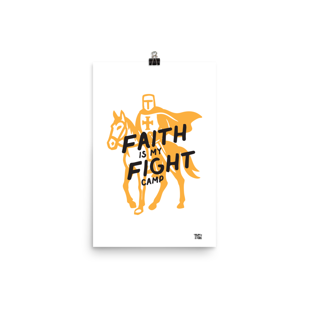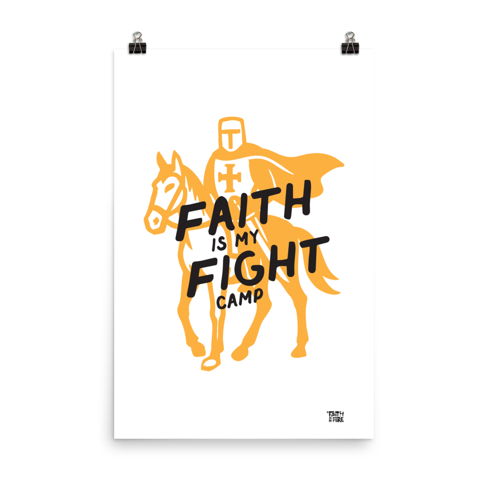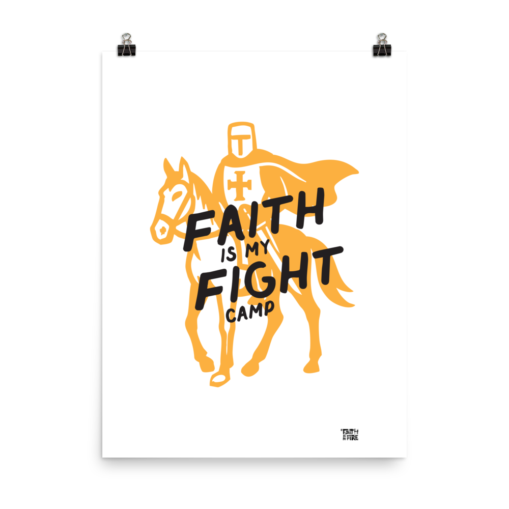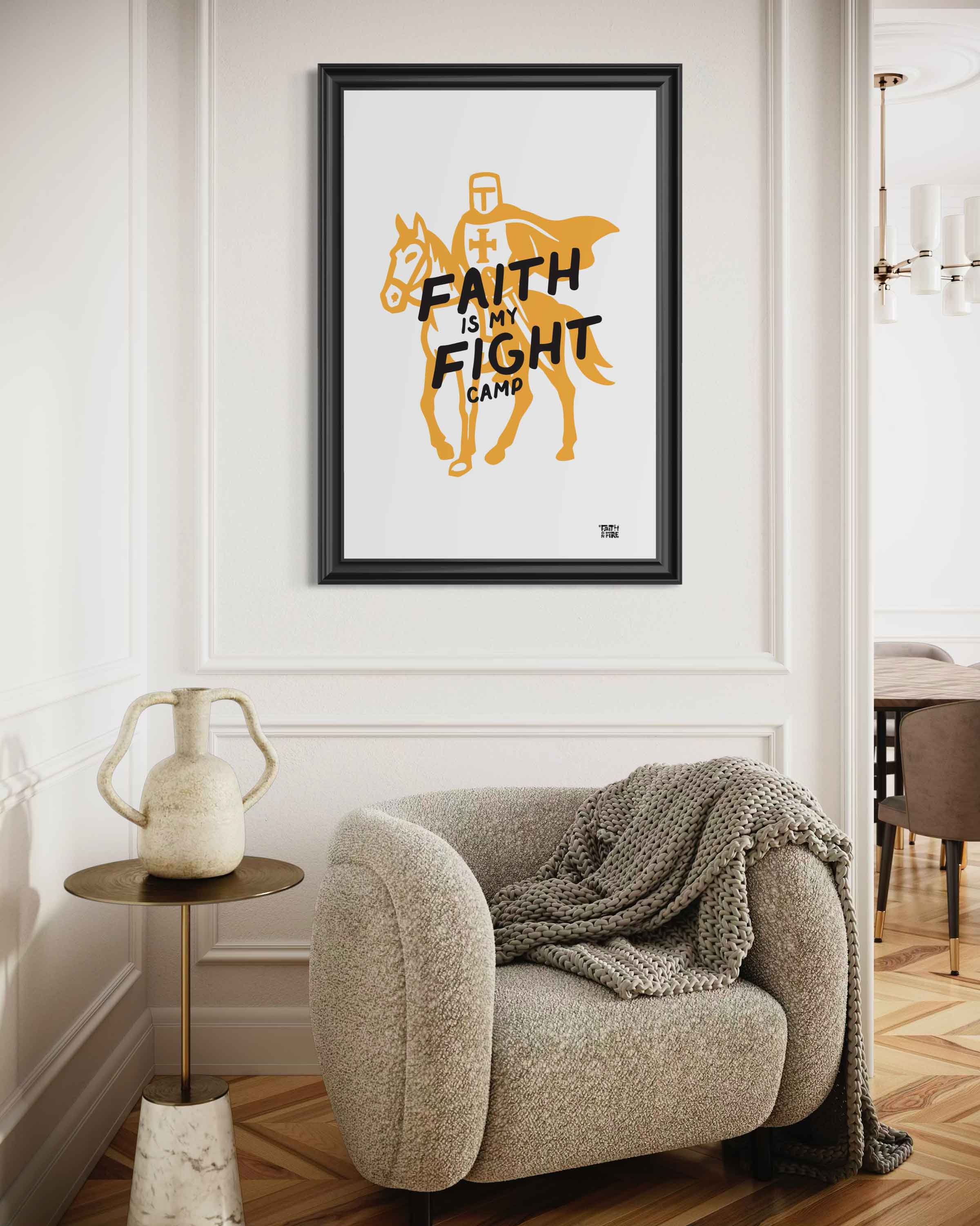 A bold Faith on Fire graphic featuring a crusader knight on horseback, paired with the phrase “Faith Is My Fight.” The design blends heroic imagery with a clean, modern illustration style, capturing the idea of standing firm with conviction and purpose. Strong lines and dynamic shapes create a sense of movement and resolve, making this artwork a striking symbol of spiritual strength, perseverance, and unwavering belief. Suitable for a wide range of formats, from prints to accessories.