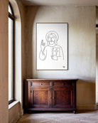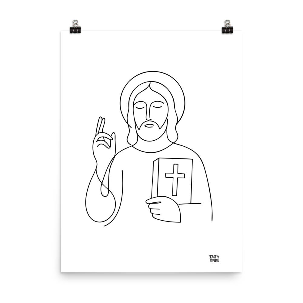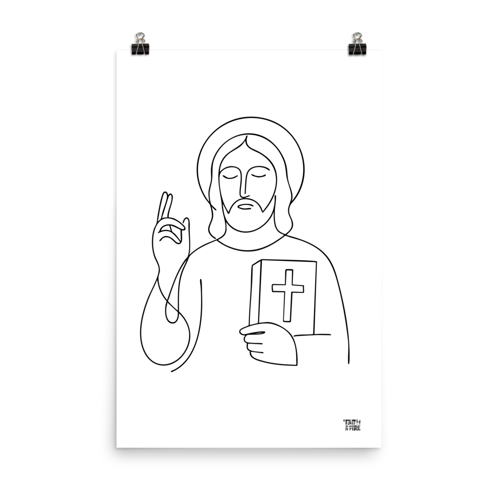 A contemporary reinterpretation of the Christ Pantocrator icon, drawn with clean modern lines while preserving the timeless gesture of blessing and the symbol of the Scriptures. This minimalist design brings ancient Christian imagery into a fresh, modern aesthetic that fits beautifully in any setting. A meaningful piece for those who appreciate sacred art, simplicity, and symbols of faith expressed with clarity and intention.