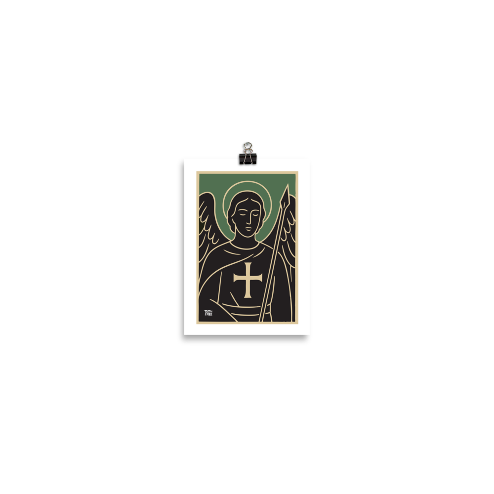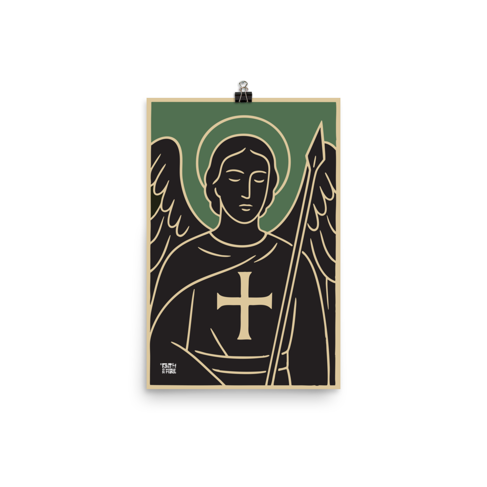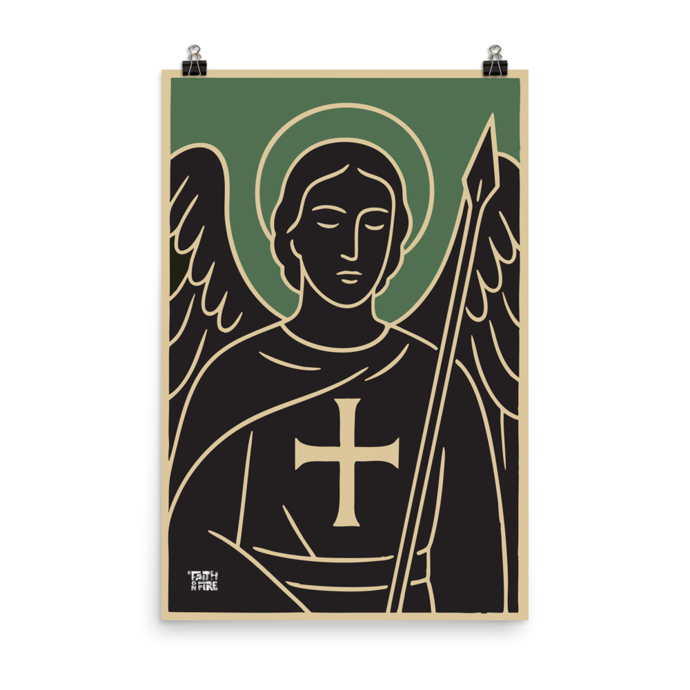 A striking Faith on Fire illustration of an archangel rendered in a clean, minimal-line icon style. The serene expression, flowing wings, and strong cross insignia create a sense of steadfast protection and divine authority. With its balanced composition and muted, timeless color palette, this artwork brings a modern clarity to one of faith’s most enduring symbols. Ideal for any space that seeks a reminder of courage, guidance, and heavenly guardianship.