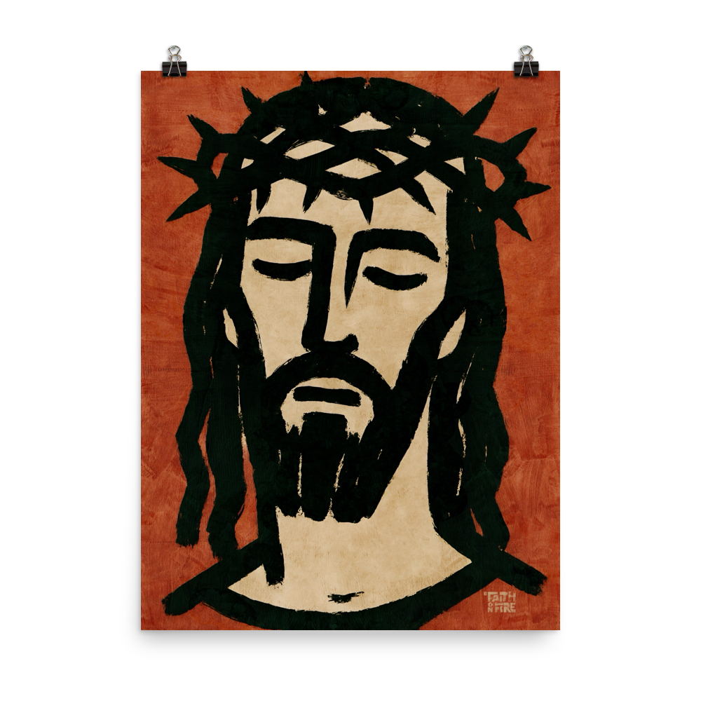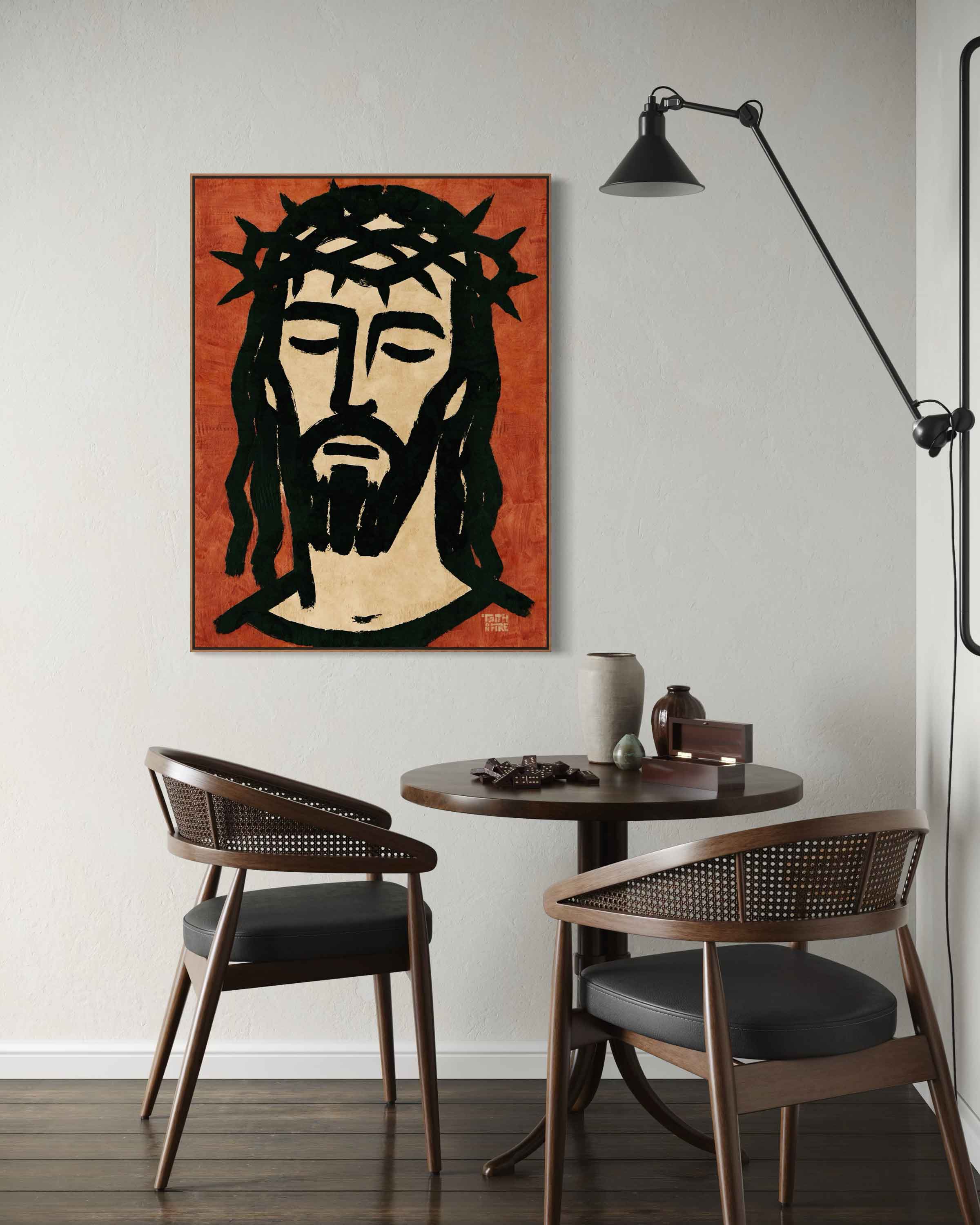 A striking, handcrafted-style portrait of Jesus wearing the crown of thorns, created with bold black brushstrokes and a warm, textured backdrop. The simplicity of the lines and the raw, expressive style give the piece the feel of an ancient sacred icon brought into a modern world. This artwork is a powerful reminder of sacrifice, mercy, and unwavering love — a meaningful addition to any home, prayer space, or collection of faith-centered art.