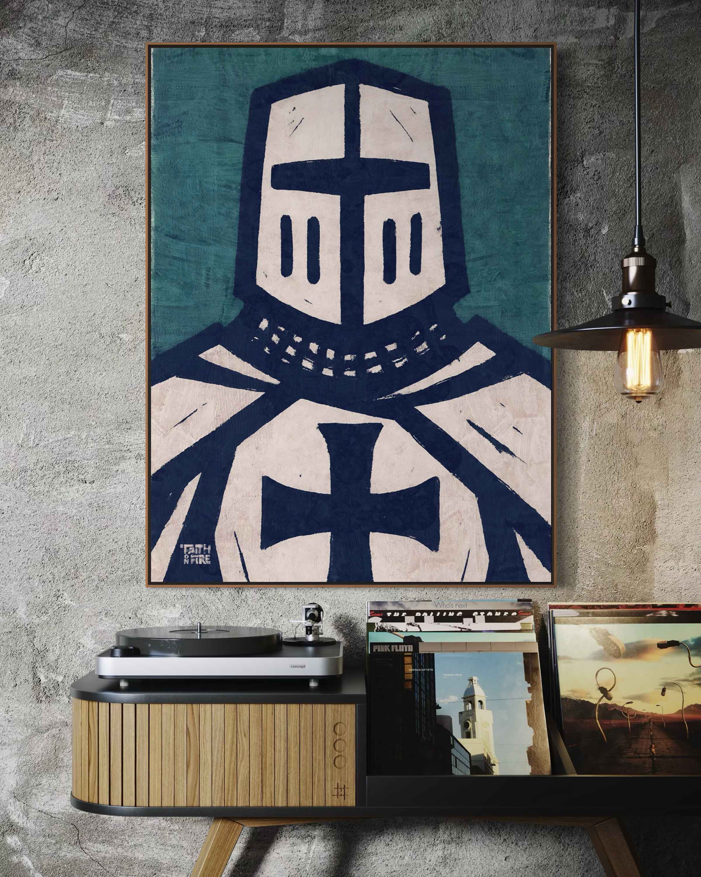 A bold, battle-ready illustration of a crusader knight, rendered in a rugged hand-drawn style with deep navy lines and a weathered texture. The simple cross on the helmet and tunic gives the piece a timeless, iconic presence — a symbol of conviction, mission, and unwavering spiritual discipline. Perfect for Christian wall art or anyone drawn to the imagery of courage, duty, and faith that stands firm in every season.