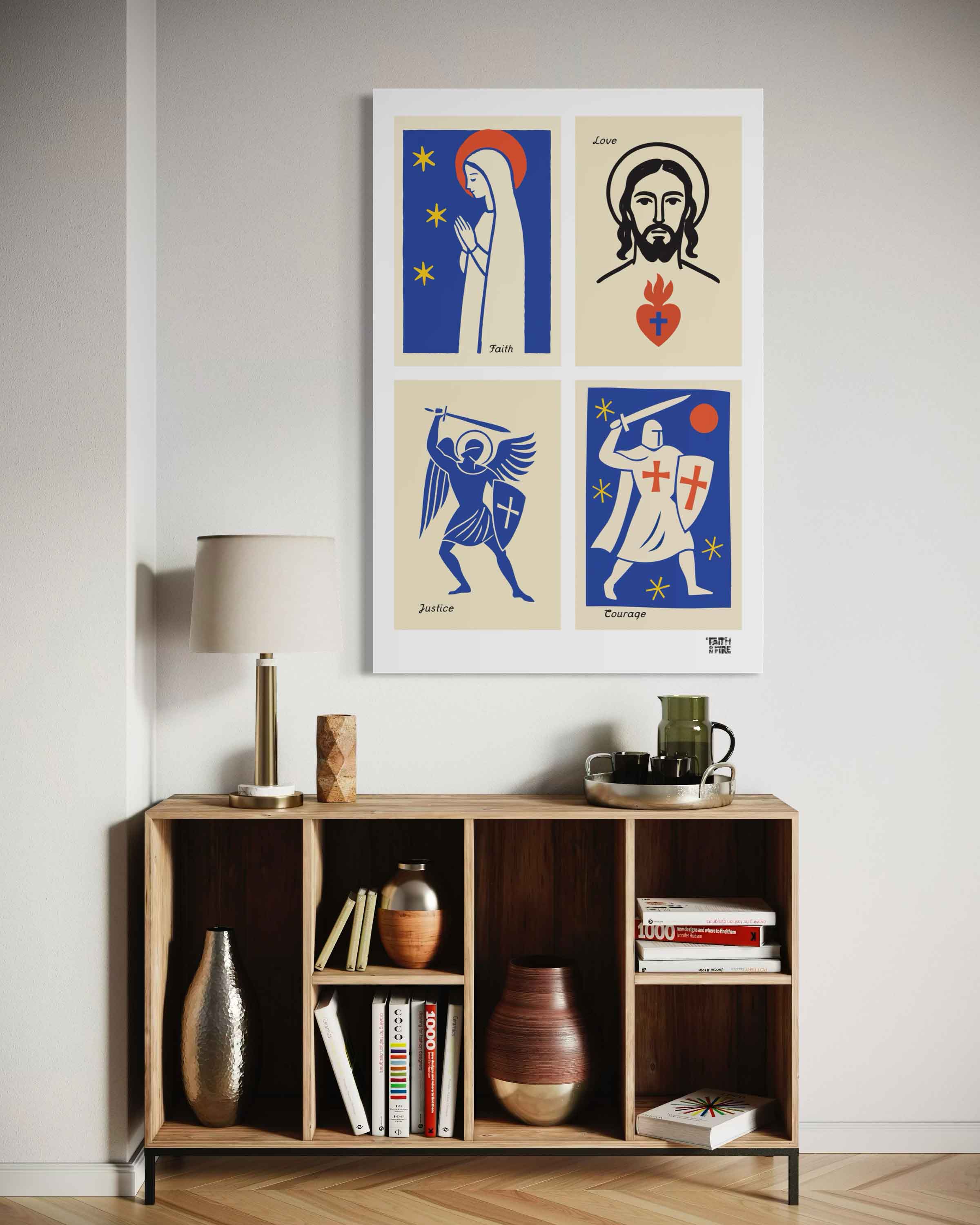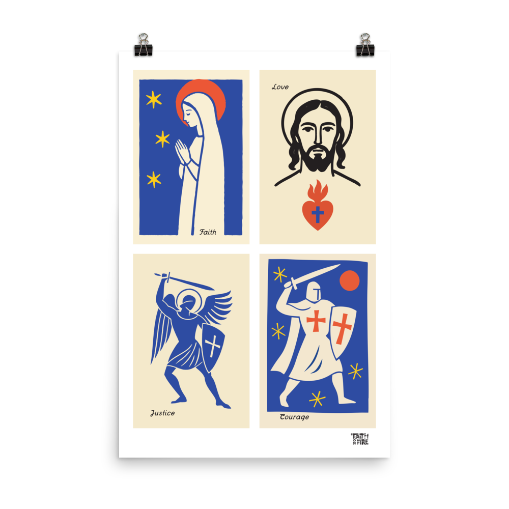 Four bold icons, one powerful story. This design brings together Mary in prayer, the face of Christ with the Sacred Heart, a warrior angel, and a crusader knight. Each panel carries a virtue that shapes the Christian life. Faith, Love, Justice, and Courage.