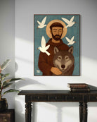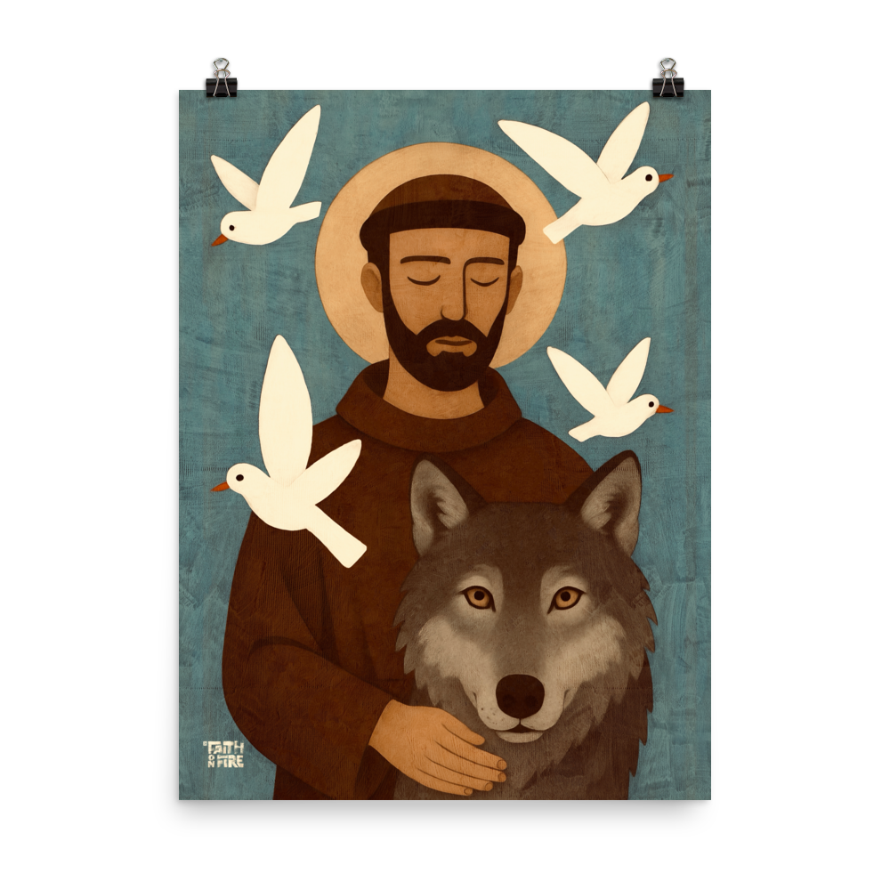 Set in soft earth tones and calm blues, the piece carries a quiet strength: compassion over violence, peace over fear, creation resting together under God’s care. Perfect for anyone who loves Saint Francis, animals, or the reminder that grace can transform even the wildest heart.