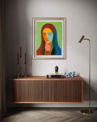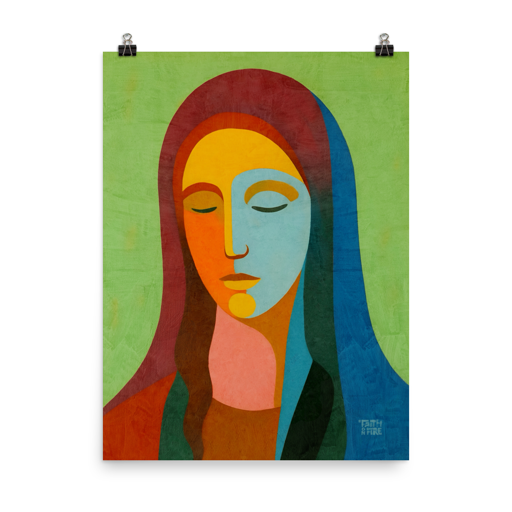 A serene Faith on Fire portrait of Mary illustrated in bold, harmonious color fields and soft, textured shading. Her closed eyes and calm expression radiate peace, humility, and maternal grace. The vibrant palette and modern geometric forms give this traditional subject a fresh, contemporary presence while preserving its sacred warmth. A contemplative artwork that brings beauty, tenderness, and spiritual quiet to any space.