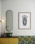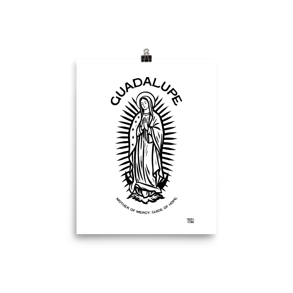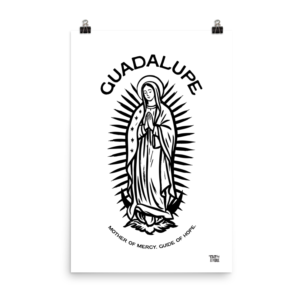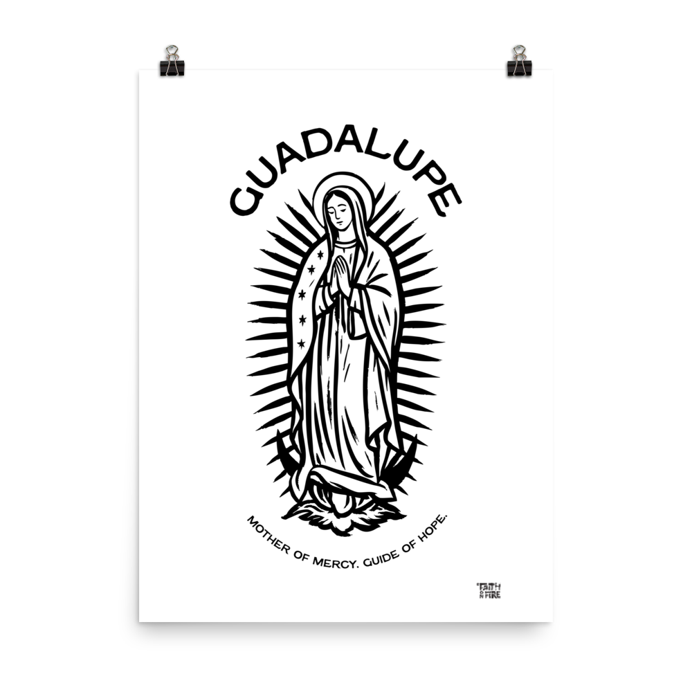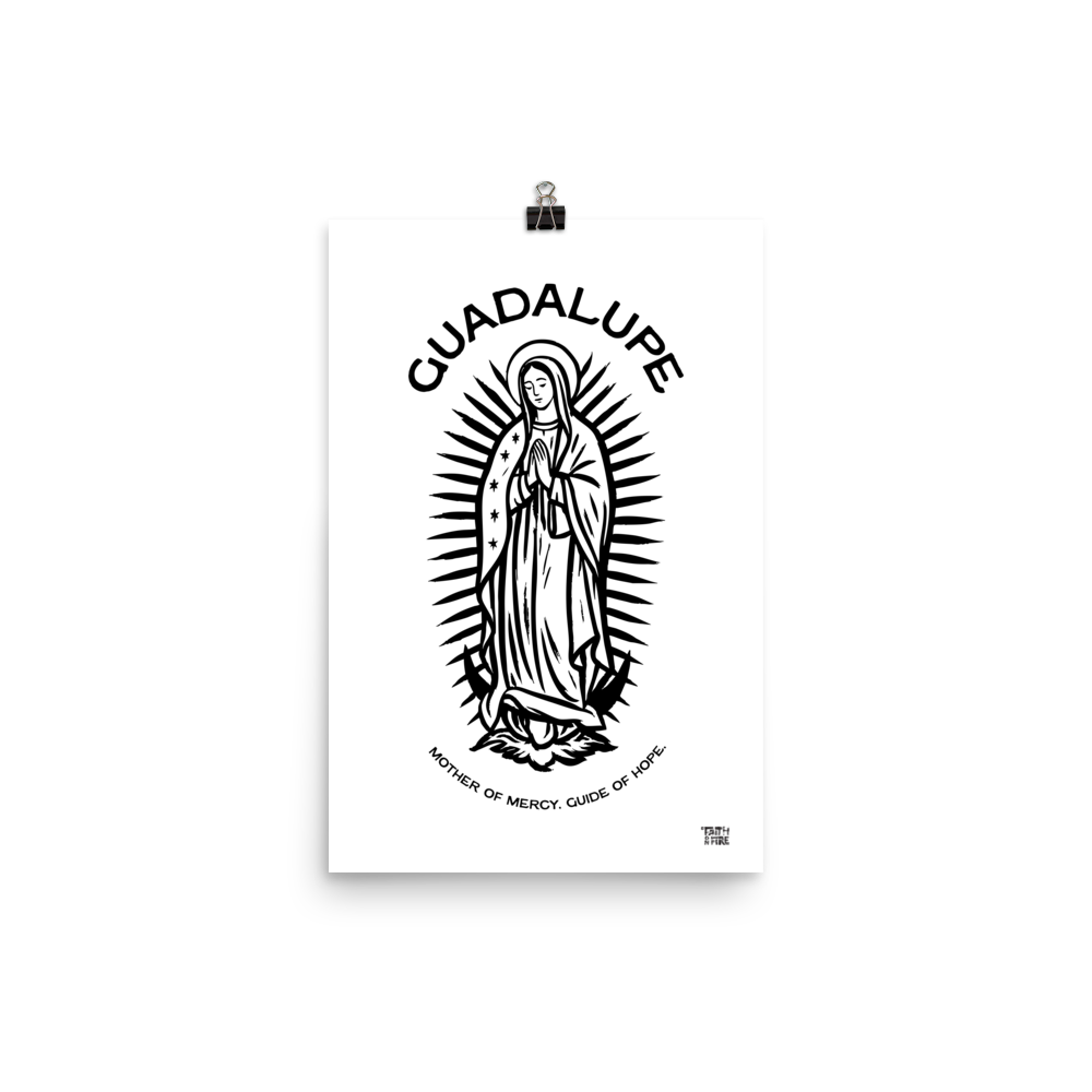 A beautifully styled Faith on Fire illustration of Our Lady of Guadalupe, depicted with her familiar mantle of stars and radiant backdrop. The design captures the serene strength of Mary as Mother of Mercy and Guide of Hope, honoring one of the most beloved images in Christian tradition. Clean lines, bold contours, and a timeless composition make this artwork a meaningful presence in any space, inviting reflection, comfort, and a sense of divine protection.