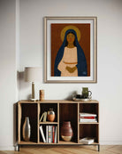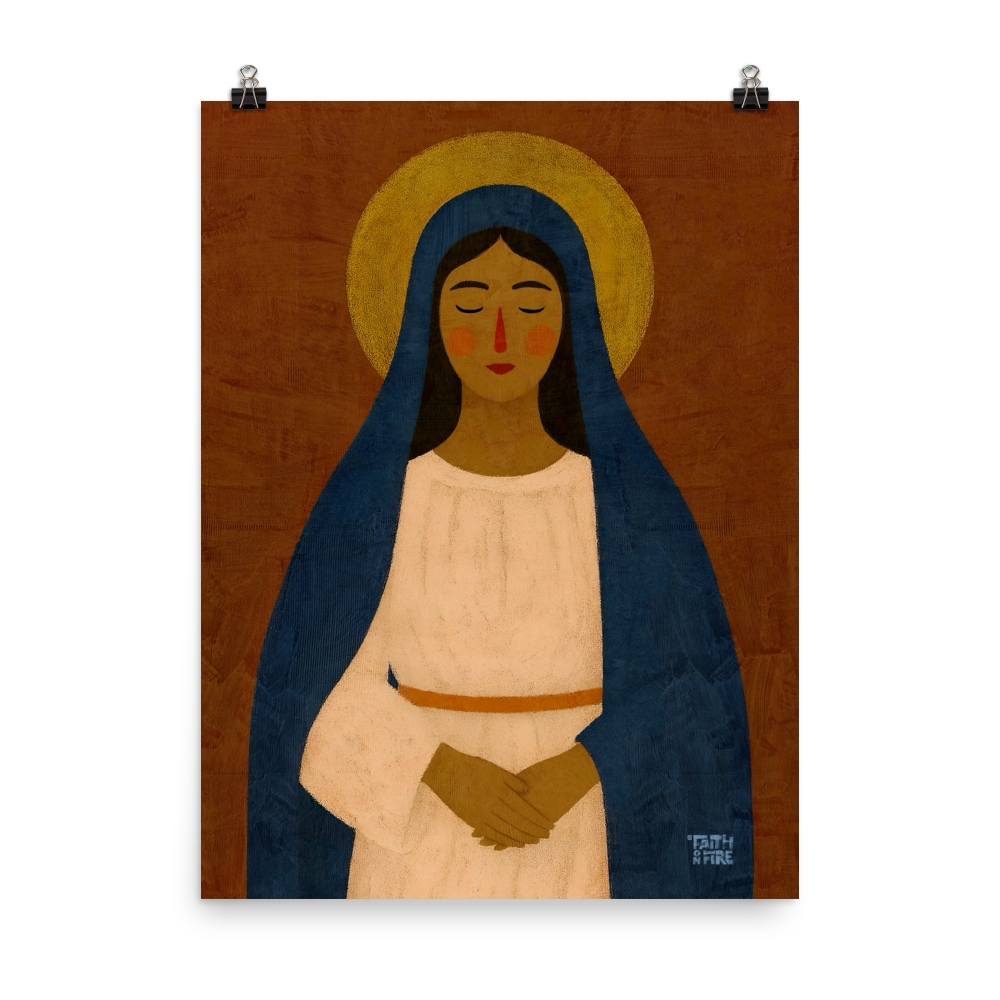 A gentle Faith on Fire illustration of Mary portrayed in warm, earthy tones and soft geometric shapes. Her closed eyes, folded hands, and deep blue mantle create a sense of serenity, purity, and quiet devotion. The textured golden halo and rich background give the artwork a sacred, timeless presence. This modern Marian icon offers a calming reminder of grace, humility, and the peace that flows from a faithful heart.