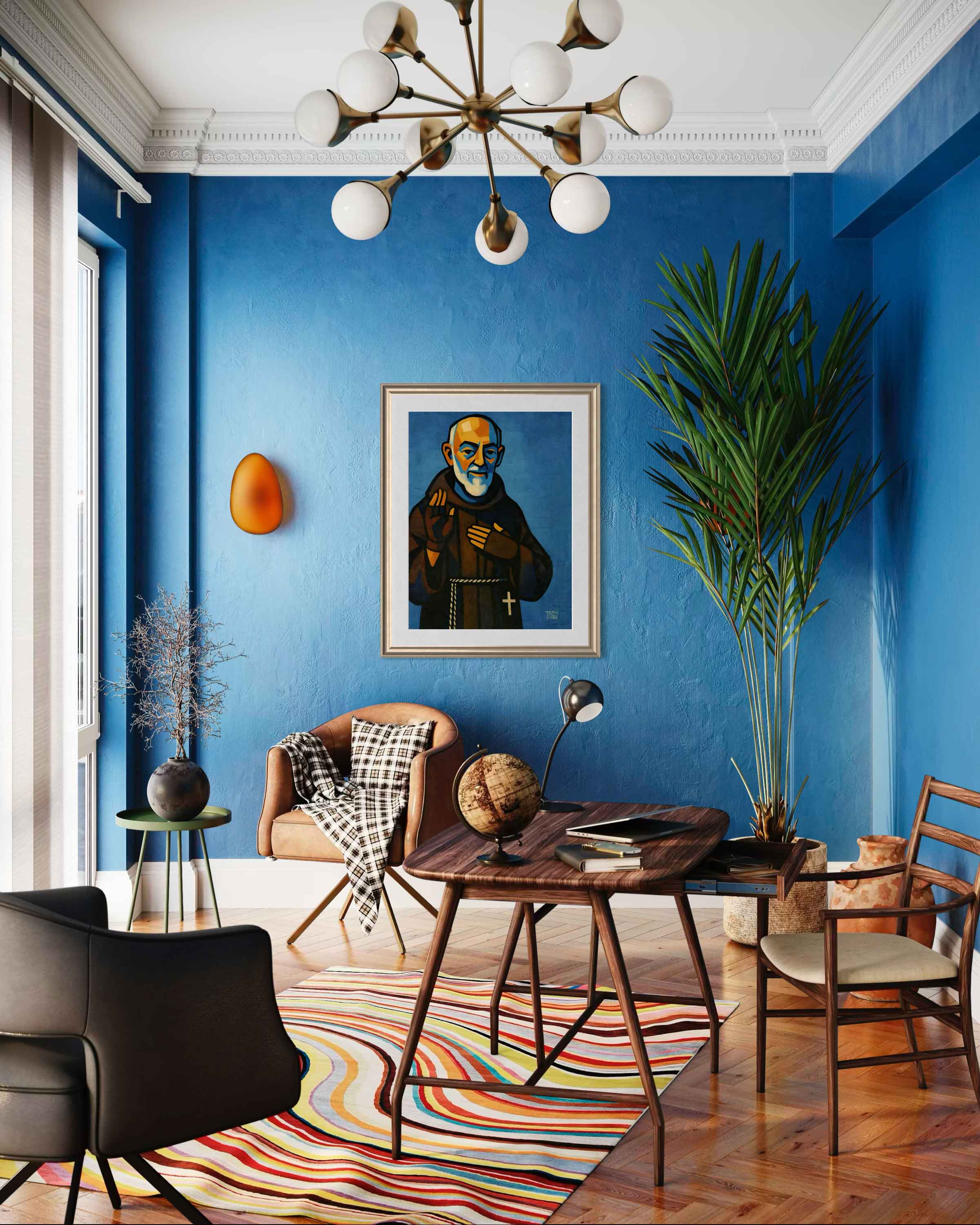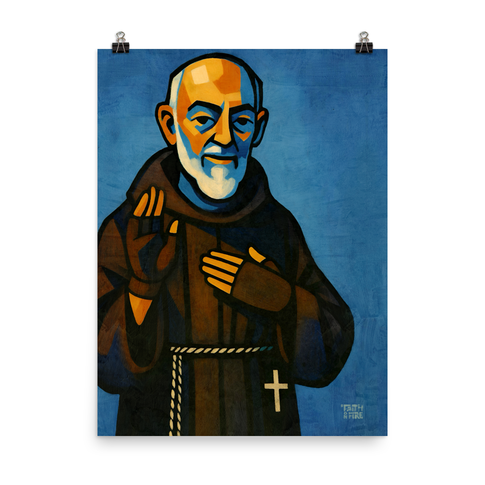 A striking Faith on Fire portrait of Padre Pio, depicted in a modern, geometric sacred-art style with bold shapes, deep blues, and warm highlights. His gentle expression and raised hand echo his legacy of compassion, prayer, and quiet endurance. The friar’s robe, rope belt, and simple cross emphasize a life devoted to service and sacrifice. This piece brings a contemporary yet reverent take on a beloved saint whose faith inspired millions. A meaningful addition to any space seeking peace, devotion, and spiritual strength.