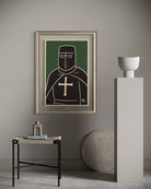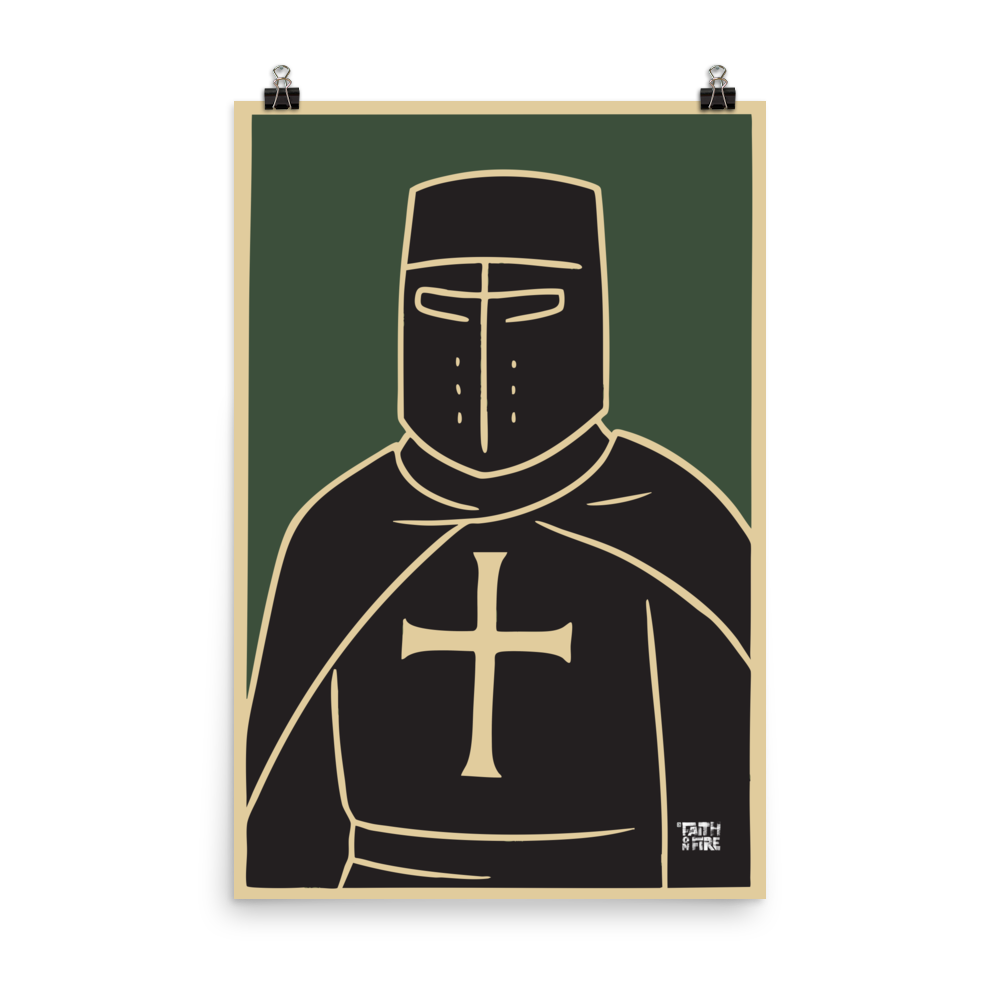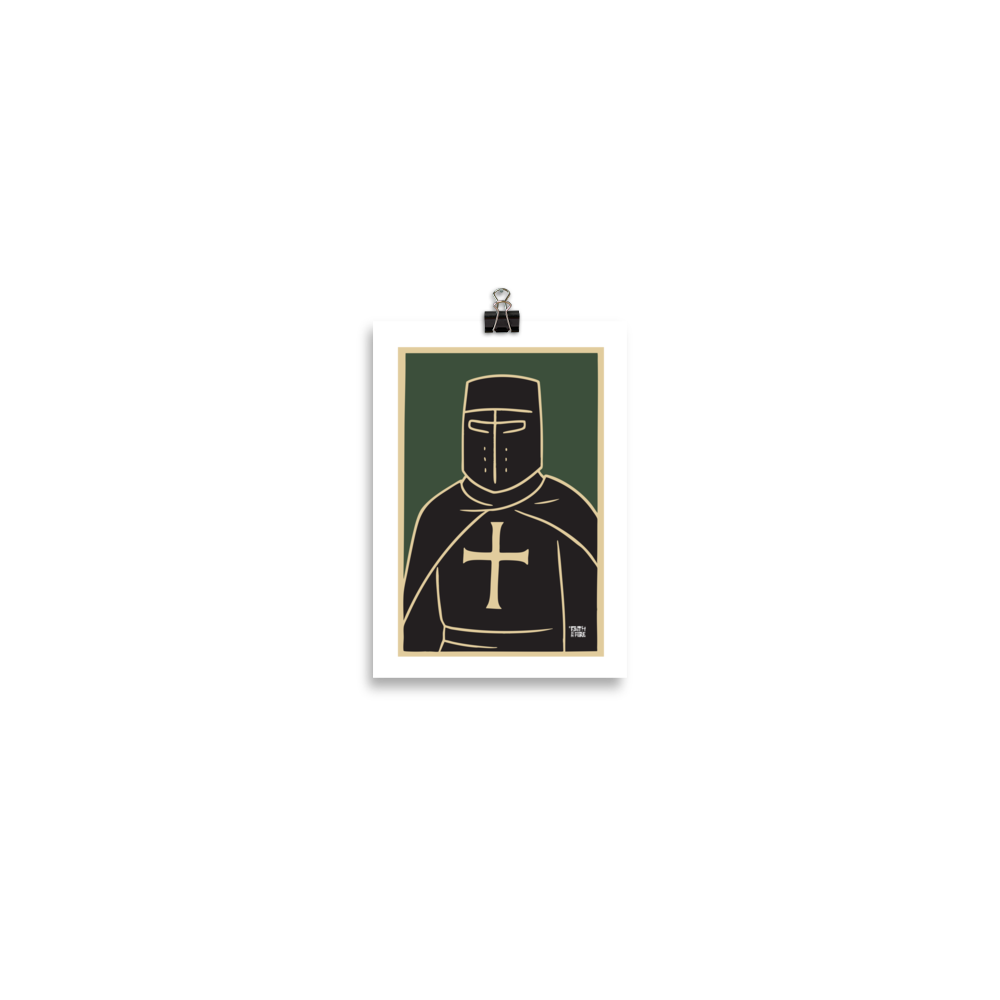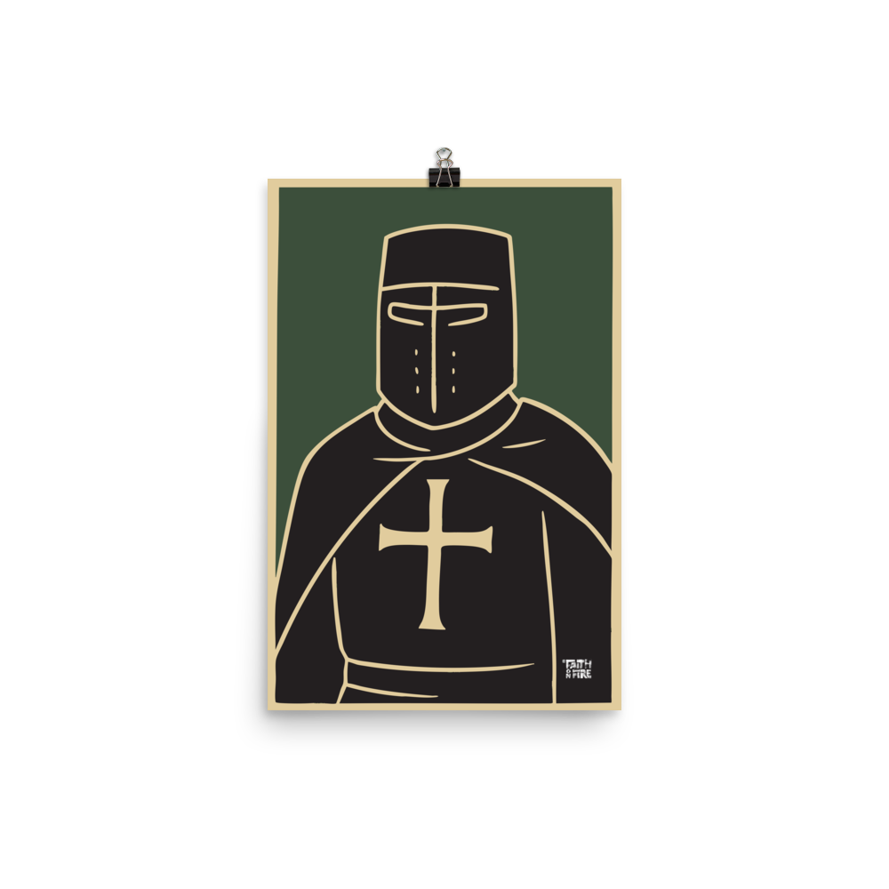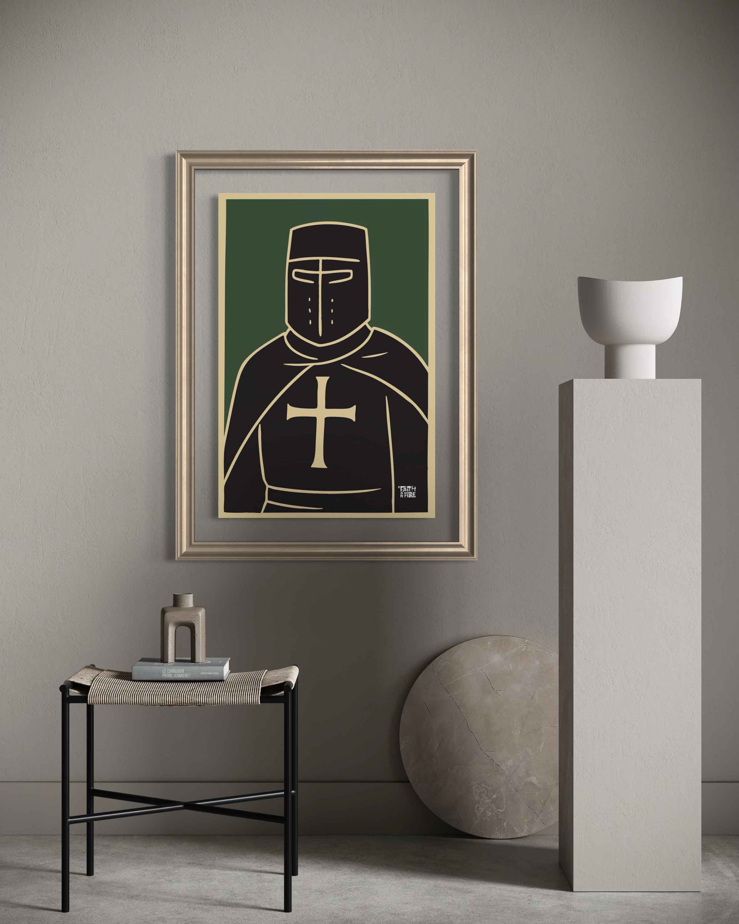 A bold Faith on Fire illustration of a Templar knight rendered in a clean, minimal-line style. The strong silhouette, iconic cross, and muted color palette give the artwork a sense of resolve and quiet strength. This modern interpretation of medieval Christian symbolism captures themes of duty, conviction, and spiritual courage. Its simple geometry and focused composition make it a striking piece for any setting where faith and fortitude are honored.